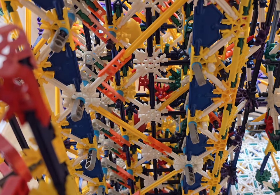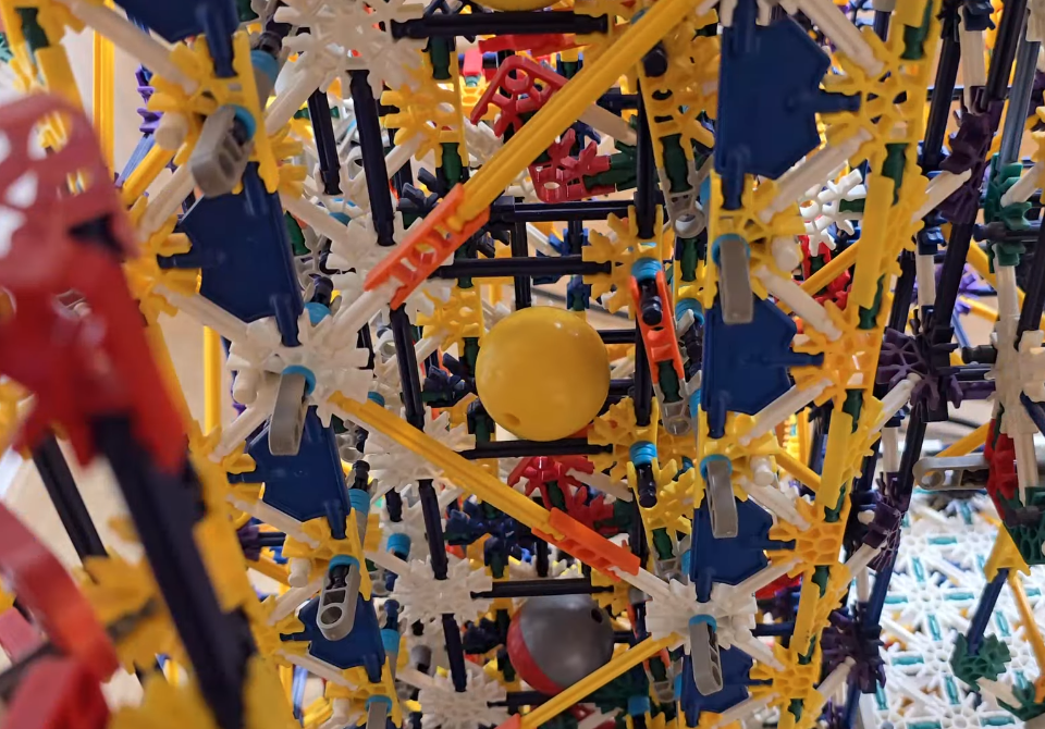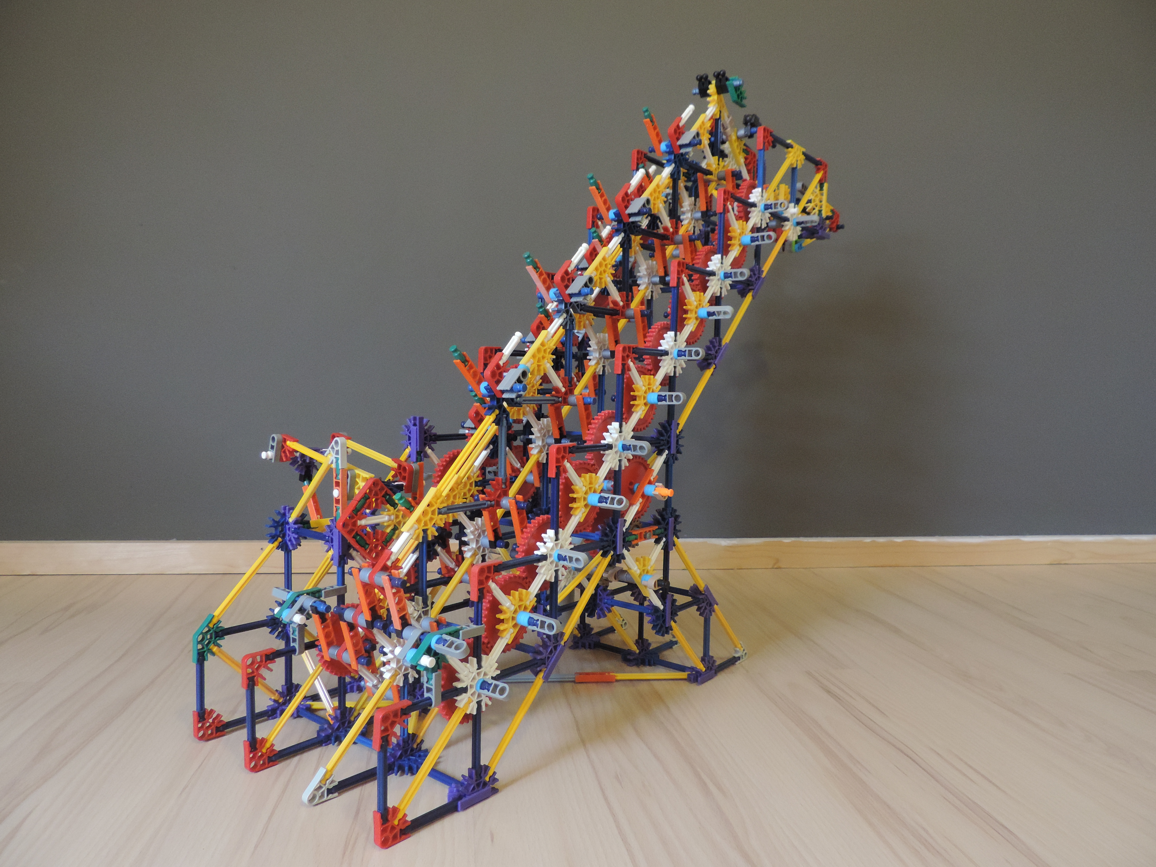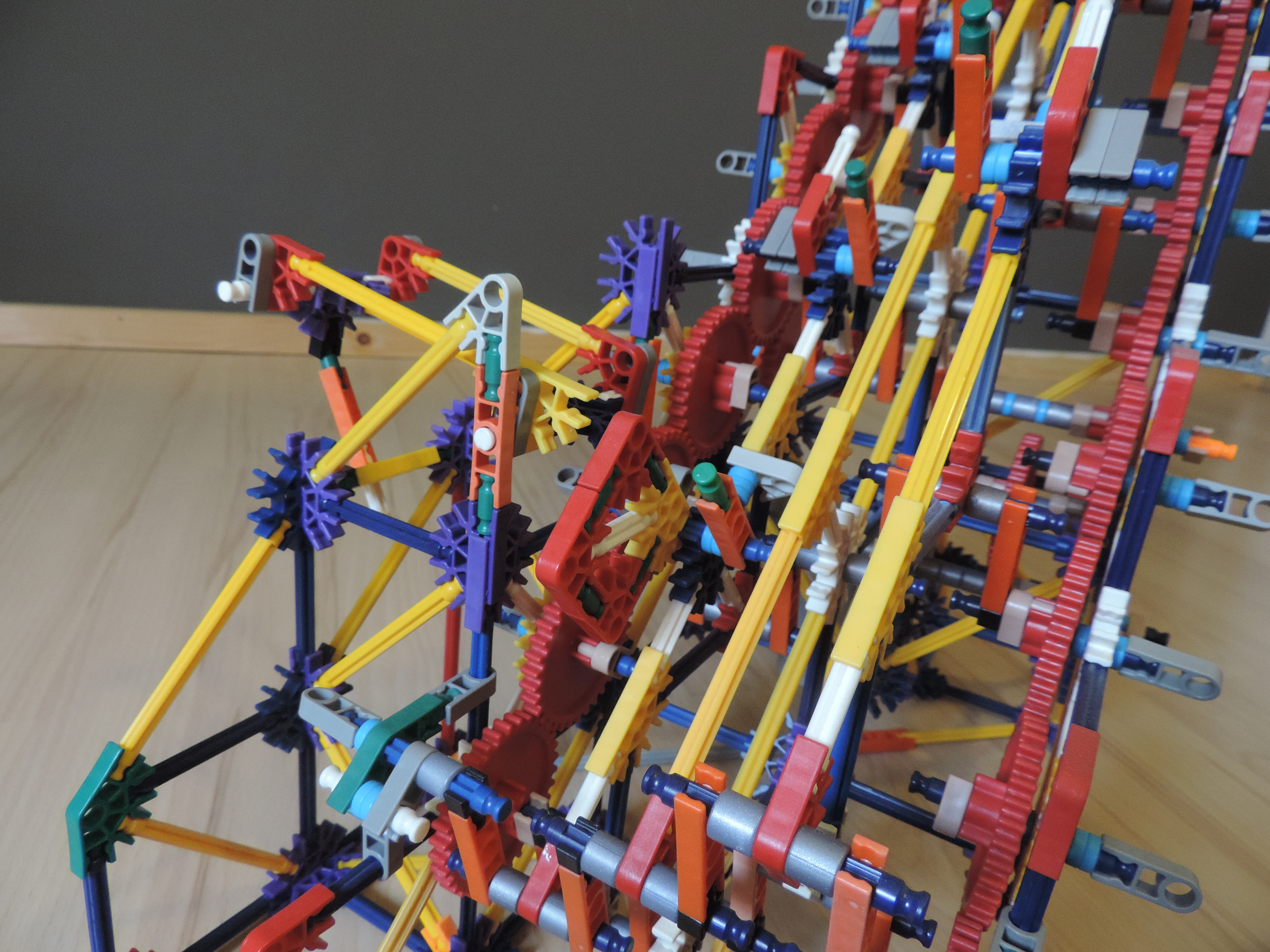 This is much like a normal jigsaw lift, except it’s going straight up instead of diagonal, which saves space and time. The balls go up a freefall step by step with the help of small holders similar to an alternator lift. This is an example of connecting cranks with driveshafts rather than a geartrain. There is a different version made by mathsboy314.